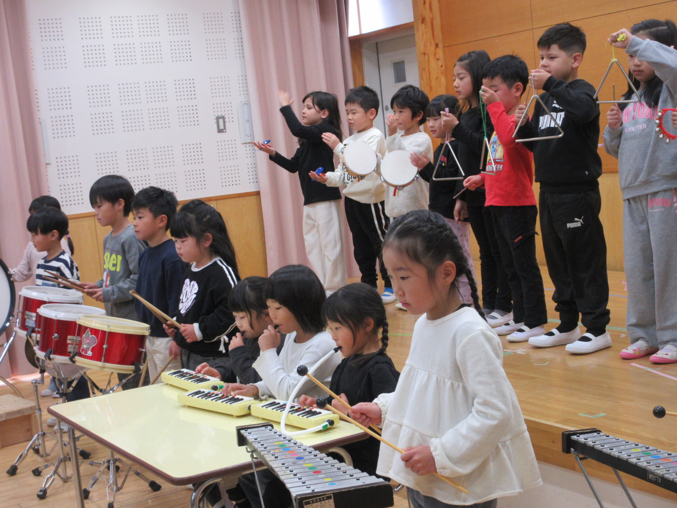 すみれ組はそれぞれやりたい楽器を選んで演奏し、初めての楽器にも挑戦!